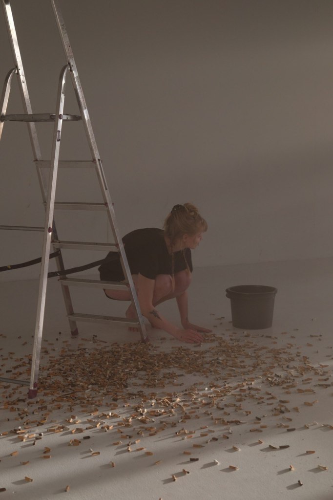 In the performance we wanted to work with materials that inspired us: cigarette buds, tape and a theater weight. All of the materials and acts held significance: remaining unseen, appearing, setting boundaries with the audience, controlling the gaze, carrying the weight. We spent hours picking up the cigarette buds. For me it was as great of a part of the performance as the actual showing.